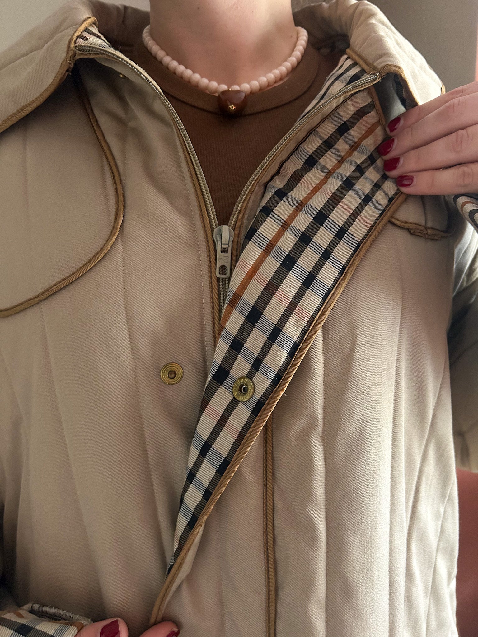 - Great, classic vintage DAKS sand coloured quilted jacket with iconic Aquascutum-style check lining