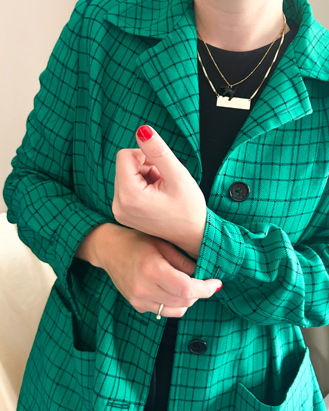 No fabric info but feels like a soft poly/viscose blend in keeping with a lot of tailoring from that era