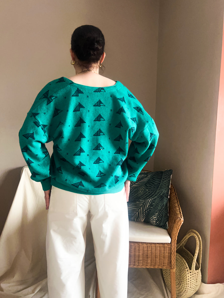 - Striking vintage all over graphic knit cardigan in a gorgeous shade of green (almost a teal colour) with black triangular pattern
